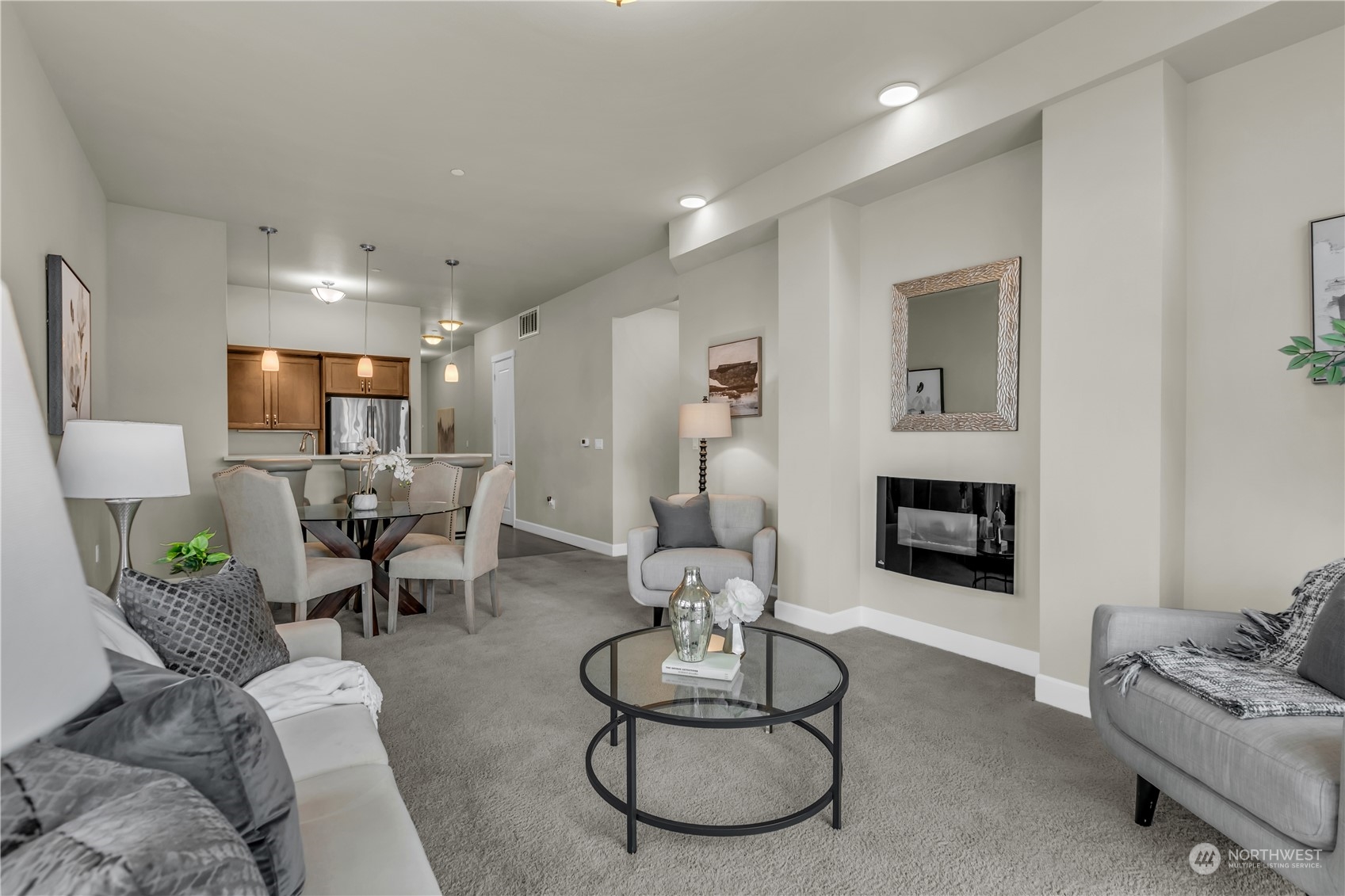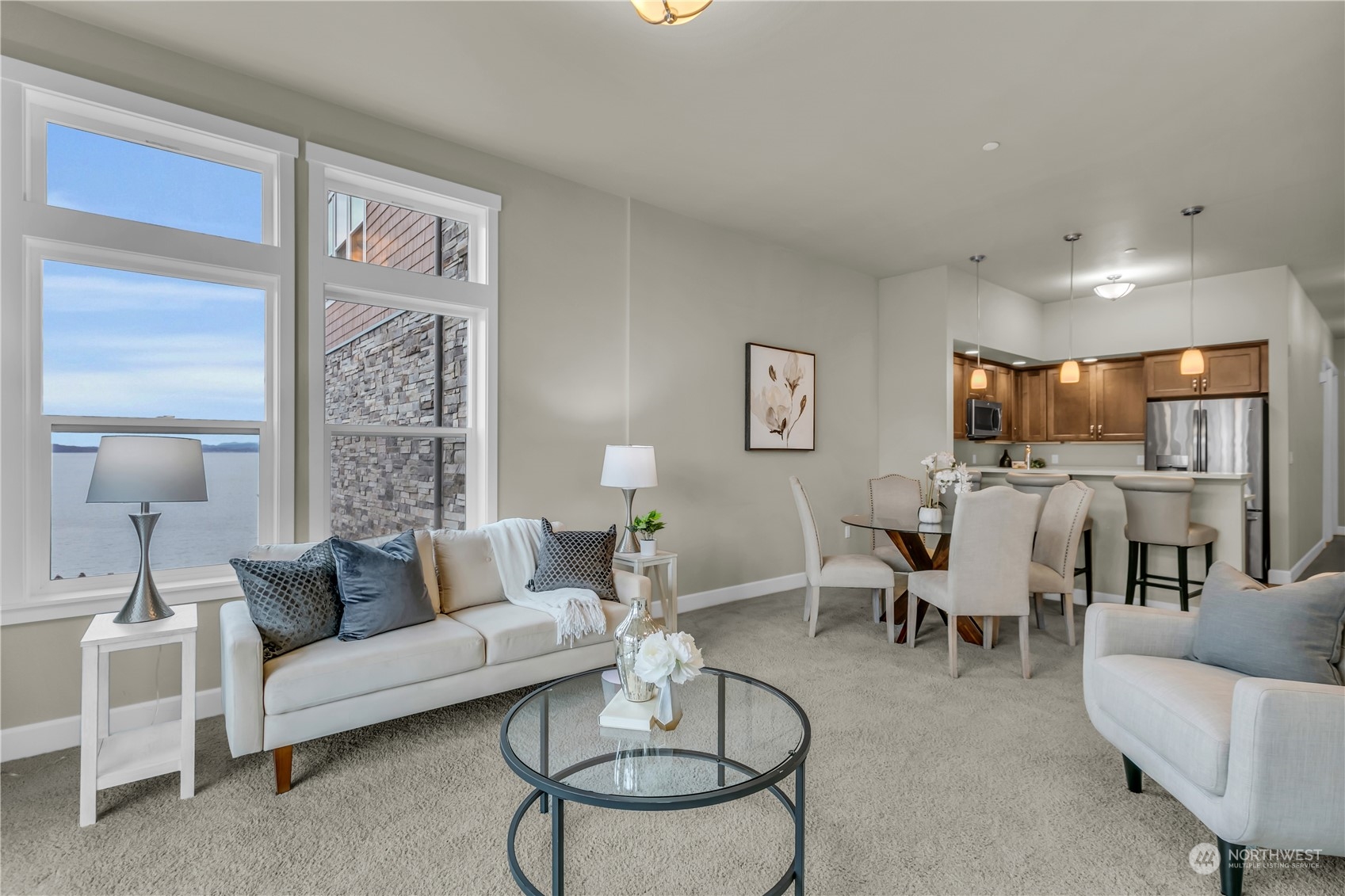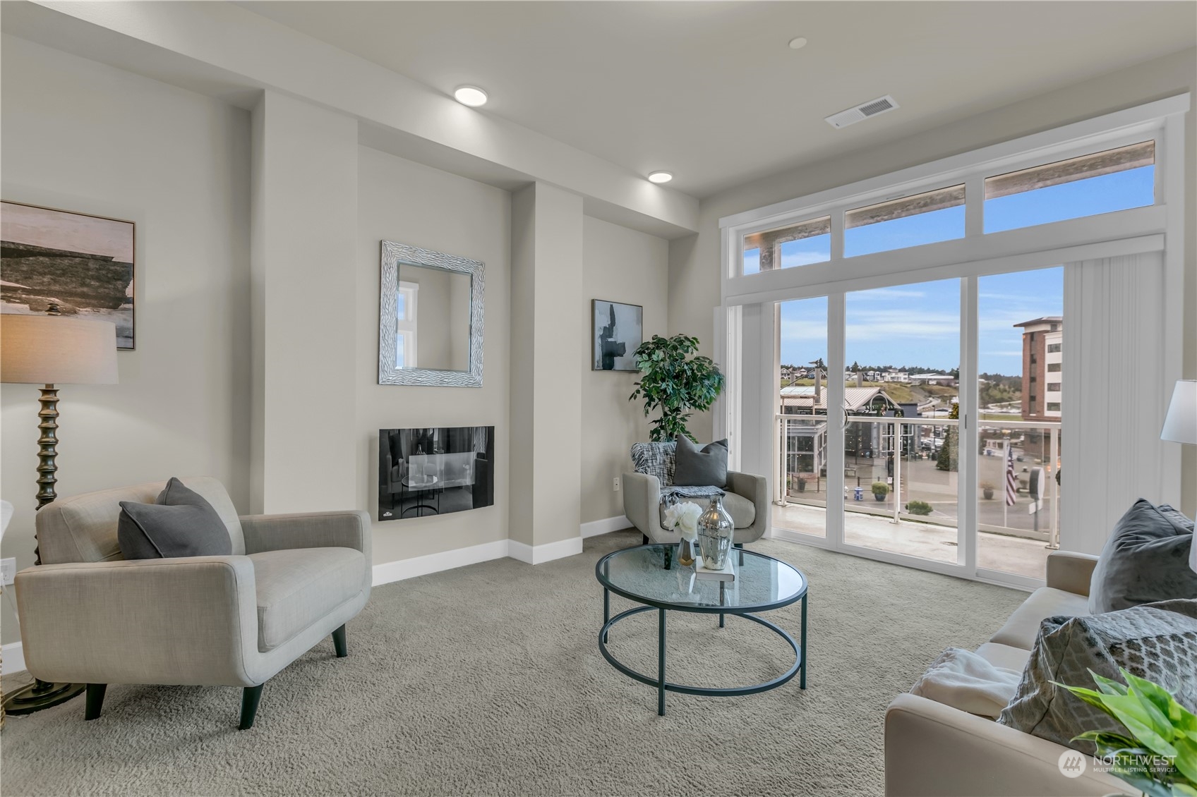 Welcome home to this beautiful, 3 bed/2 bath Point Ruston condo! Featuring high ceilings, a gas fireplace, hardwood floors, quartz counter tops and stainless steel appliances (all stay)! The primary suite has a large, walk-in closet, it's own private bath, and deck access! Enjoy the view from your deck overlooking Commencement Bay & Point Ruston's Grand Plaza.